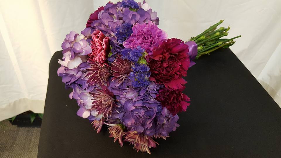 Mixed flower bridal bouquet of purple hydrangea, purple mums, statice, and deep pink and purple carnations with a purple silk hand wrap. |