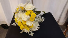 Bridal bouquet designed with white roses, yellow cushion mums and dusty miller accented with white chiffon hand wrap. |