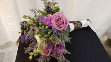 Bridal bouquet of lavender and ivory roses, white calla lilies and freesia, and plum carnations finished with an ivory chiffon hand wrap and family rosary. |