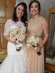 Beautiful blushing bride and bridesmaid with elegant bouquets of blush and ivory roses. |