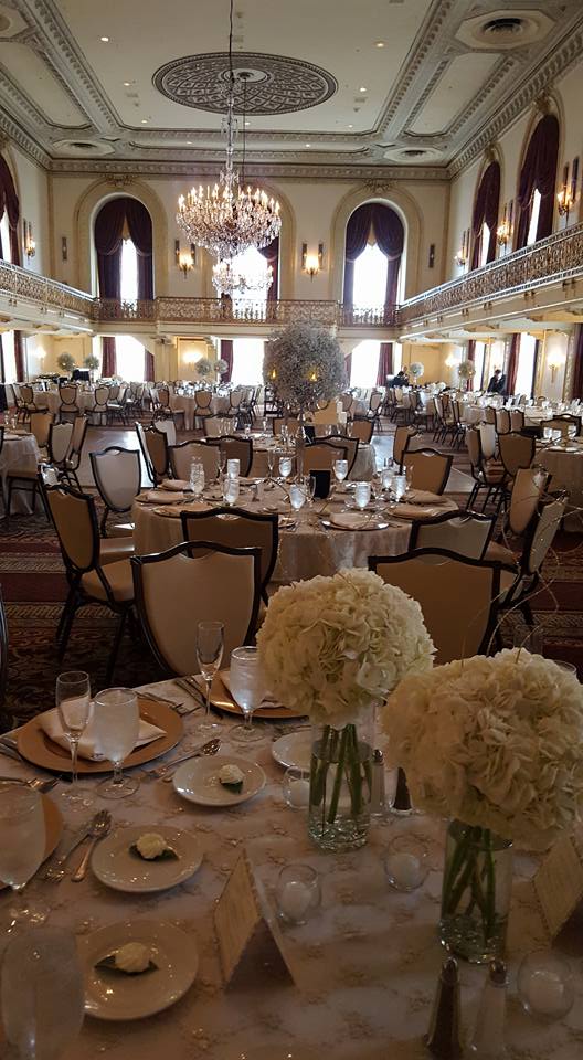 Beautiful 17th floor ballroom at the Omni William Penn decorated with a variety of centerpieces and hundreds of floating candles surrounding the mezzanine. |
