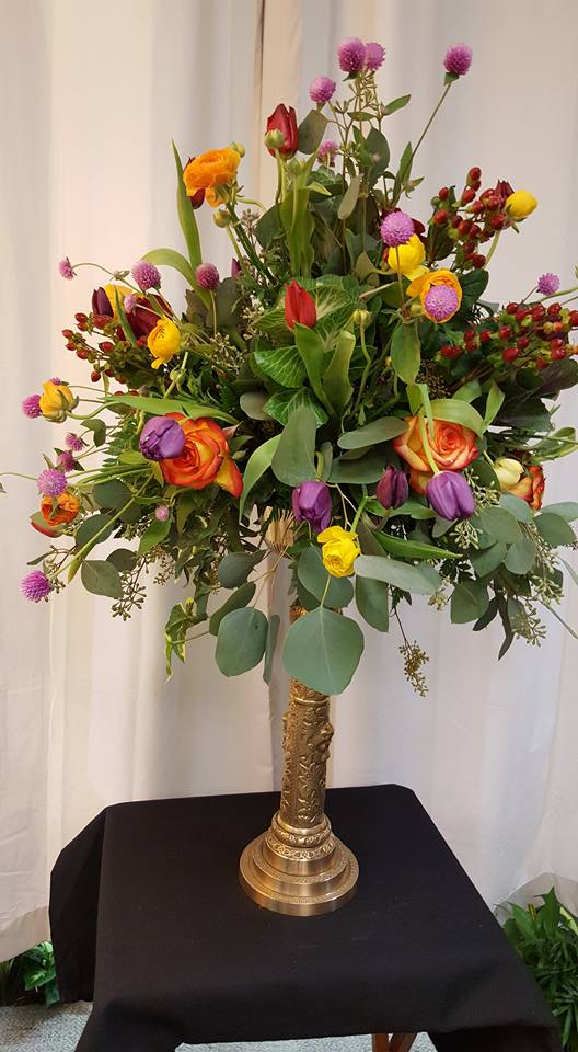 Beautiful Spring centerpiece of orange to red roses, orange ranunculus, purple and red tulips, hypericum berries, thistle, and eucalyptus on a beautiful gold riser. |