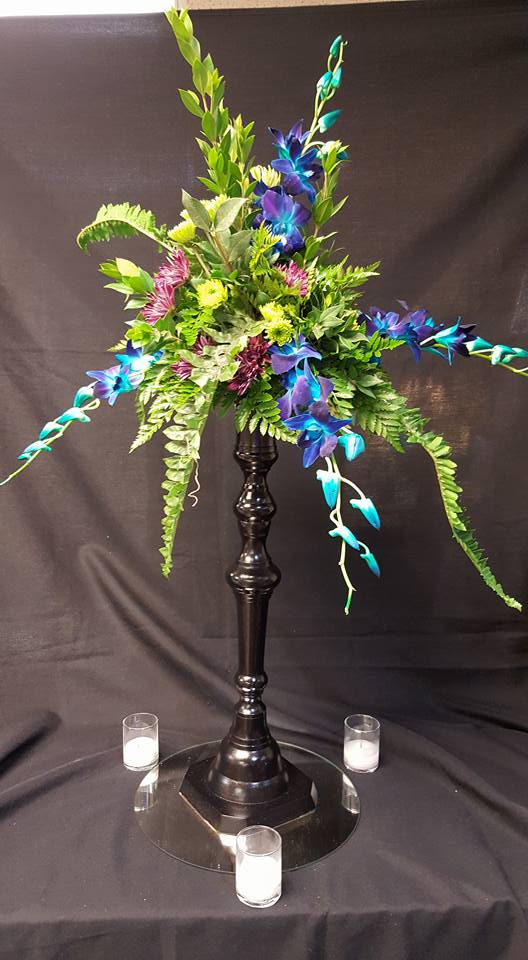 Unique centerpiece on metal riser made with blue orchids, mums and greens. |