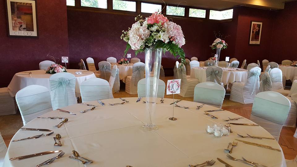 Decorated with lighted trees and centerpieces of blue larkspur, green mums, greens and branches in a sushi wrapped cube vase. |
